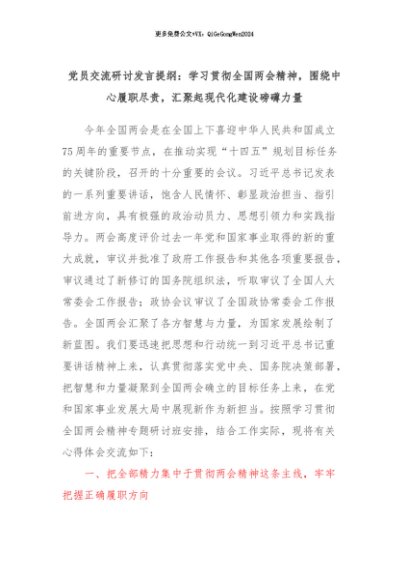 【七哥公文】2024年:党员交流研讨发言提纲:学习贯彻全国两会精神,围绕中心履职尽责,汇聚起现代化建设磅礴力量+更多免费公文+VX:QiGeGongWen2024