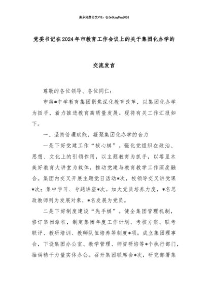 【七哥公文】2024年:党委书记在2024年市教育工作会议上的关于集团化办学的交流发言+更多免费公文+VX:QiGeGongWen2024