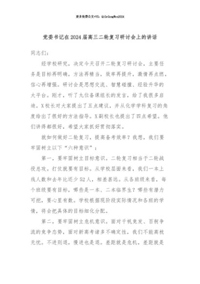 / 【七哥公文】2024年:党委书记在2024届高三二轮复习研讨会上的讲话+更多免费公文+VX:QiGeGongWen2024