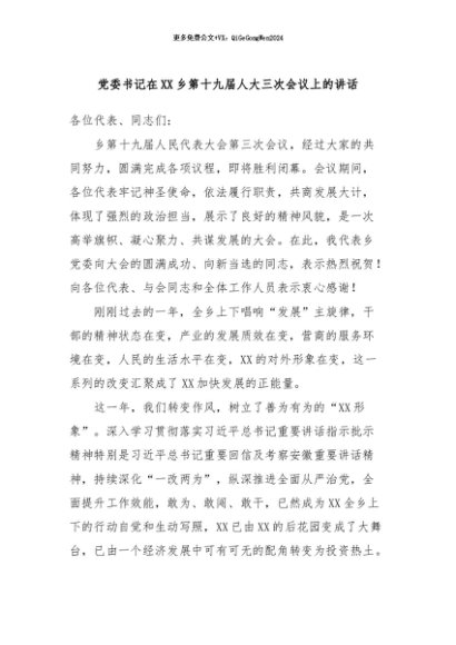 / 【七哥公文】2024年:党委书记在XX乡第十九届人大三次会议上的讲话+更多免费公文+VX:QiGeGongWen2024