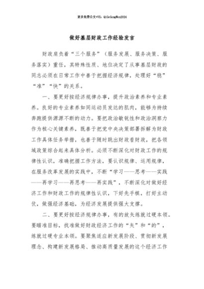 / 【七哥公文】2024年:做好基层财政工作经验发言+更多免费公文+VX:QiGeGongWen2024