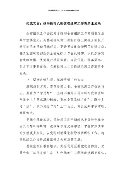 / 【七哥公文】2024年:交流发言:推动新时代新征程组织工作高质量发展+更多免费公文+VX:QiGeGongWen2024