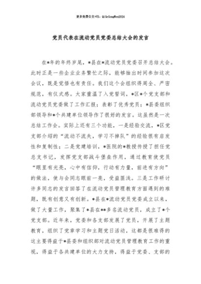 / 【七哥公文】2024年:党员代表在流动党员党委总结大会的发言+更多免费公文+VX:QiGeGongWen2024