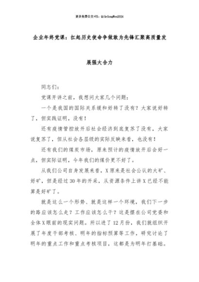 【七哥公文】2024年:企业年终党课:扛起历史使命争做敢为先锋汇聚高质量发展强大合力+更多免费公文+VX:QiGeGongWen2024