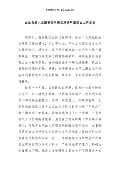 / 【七哥公文】2024年:企业负责人在国资委系统党建调研座谈会上的发言+更多免费公文+VX:QiGeGongWen2024