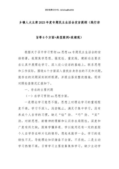 【七哥公文】2024年:乡镇人大主席2023年度专题民主生活会发言提纲(践行宗旨等6个方面+典型案例+政绩观)+更多免费公文+VX:QiGeGongWen2024