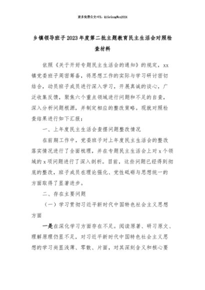 【七哥公文】2024年:乡镇领导班子2023年度第二批主题教育民主生活会对照检查材料+更多免费公文+VX:QiGeGongWen2024