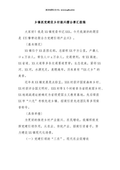 / 【七哥公文】2024年:乡镇抓党建促乡村振兴擂台赛汇报稿+更多免费公文+VX:QiGeGongWen2024