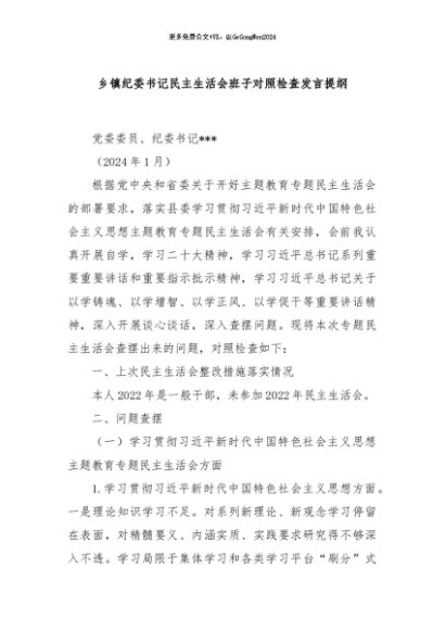 / 【七哥公文】2024年:乡镇纪委书记民主生活会班子对照检查发言提纲+更多免费公文+VX:QiGeGongWen2024