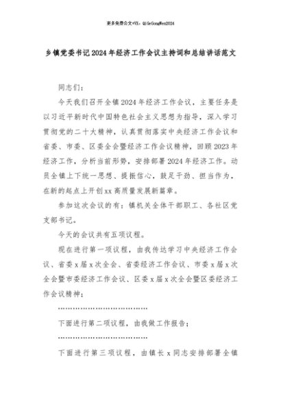 【七哥公文】2024年:乡镇党委书记2024年经济工作会议主持词和总结讲话范文+更多免费公文+VX:QiGeGongWen2024