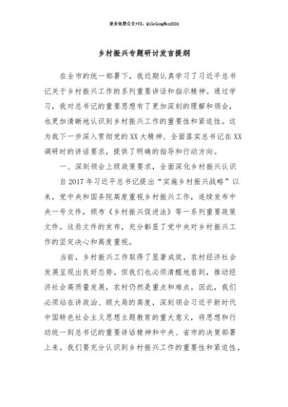 【七哥公文】2024年:乡村振兴专题研讨发言提纲+更多免费公文+VX:QiGeGongWen2024