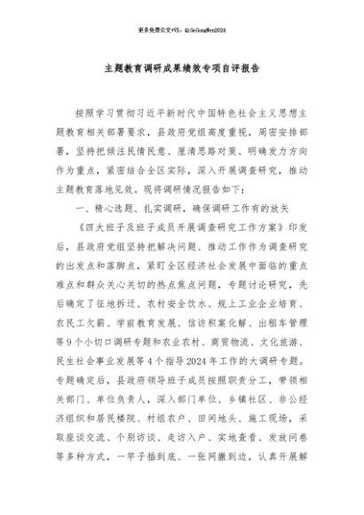 / 【七哥公文】2024年:主题教育调研成果绩效专项自评报告+更多免费公文+VX:QiGeGongWen2024