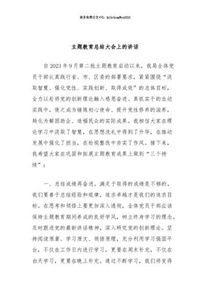 / 【七哥公文】2024年:主题教育总结大会上的讲话+更多免费公文+VX:QiGeGongWen2024