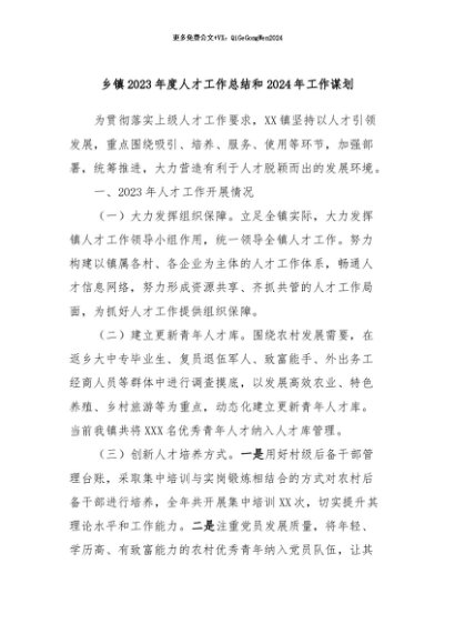 / 【七哥公文】2024年:乡镇2023年度人才工作总结和2024年工作谋划+更多免费公文+VX:QiGeGongWen2024