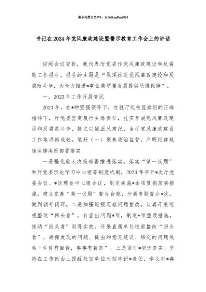 【七哥公文】2024年:书记在2024年党风廉政建设暨警示教育工作会上的讲话+更多免费公文+VX:QiGeGongWen2024