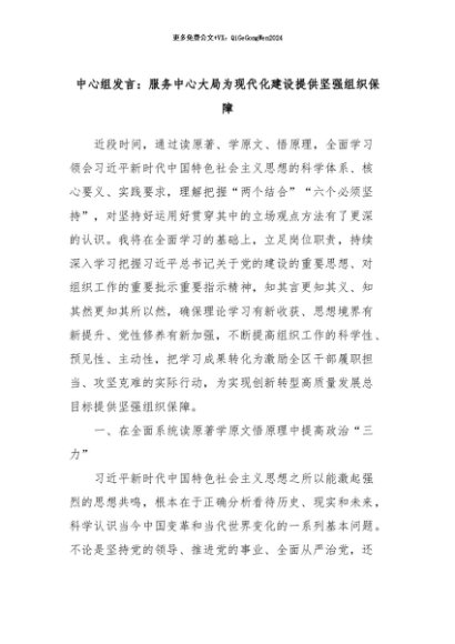 【七哥公文】2024年:中心组发言:服务中心大局为现代化建设提供坚强组织保障+更多免费公文+VX:QiGeGongWen2024