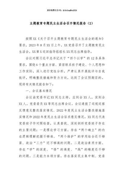 / 【七哥公文】2024年:主题教育专题民主生活会召开情况报告(2)+更多免费公文+VX:QiGeGongWen2024