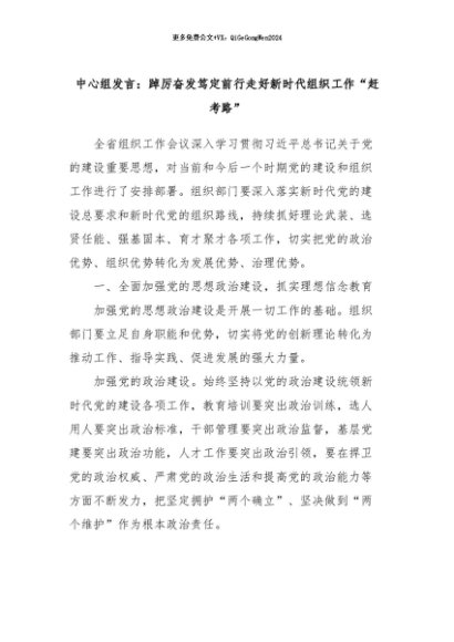 【七哥公文】2024年:中心组发言:踔厉奋发笃定前行走好新时代组织工作“赶考路”+更多免费公文+VX:QiGeGongWen2024