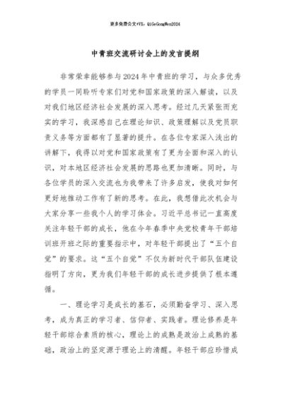 / 【七哥公文】2024年:中青班交流研讨会上的发言提纲+更多免费公文+VX:QiGeGongWen2024