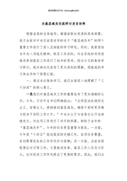/ 【七哥公文】2024年:为基层减负交流研讨发言材料+更多免费公文+VX:QiGeGongWen2024