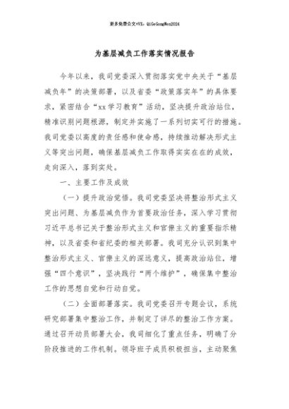 / 【七哥公文】2024年:为基层减负工作落实情况报告+更多免费公文+VX:QiGeGongWen2024