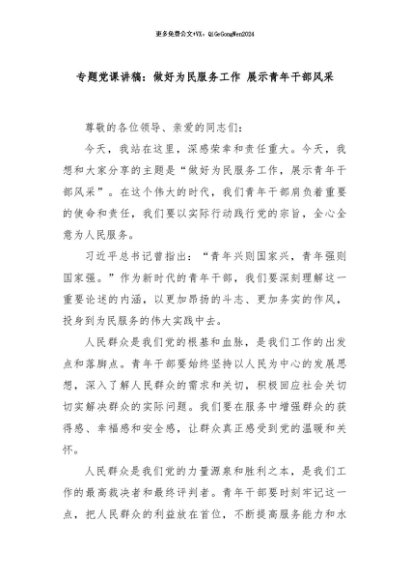 / 【七哥公文】2024年:专题党课讲稿:做好为民服务工作 展示青年干部风采+更多免费公文+VX:QiGeGongWen2024