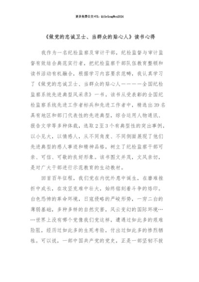 / 【七哥公文】2024年:《做党的忠诚卫士、当群众的贴心人》读书心得+更多免费公文+VX:QiGeGongWen2024