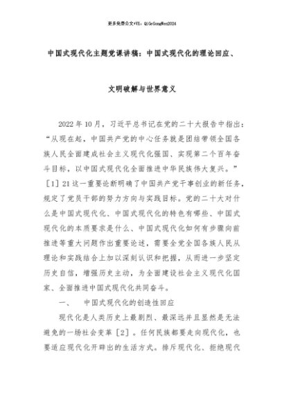 【七哥公文】2024年:中国式现代化主题党课讲稿:中国式现代化的理论回应、文明破解与世界意义+更多免费公文+VX:QiGeGongWen2024