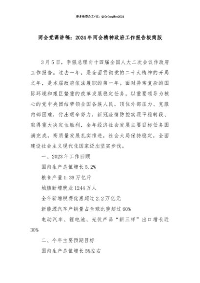 【七哥公文】2024年:两会党课讲稿:2024年两会精神政府工作报告极简版+更多免费公文+VX:QiGeGongWen2024