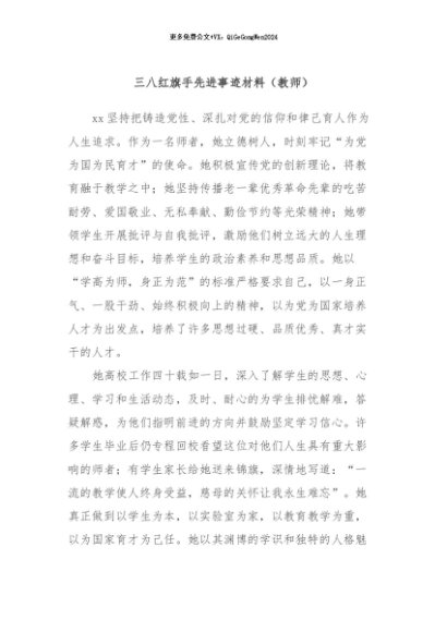 / 【七哥公文】2024年:三八红旗手先进事迹材料(教师)+更多免费公文+VX:QiGeGongWen2024