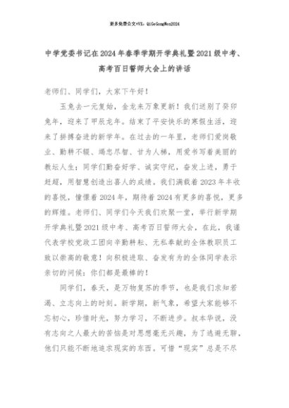 【七哥公文】2024年:中学党委书记在2024年春季学期开学典礼暨2021级中考、高考百日誓师大会上的讲话+更多免费公文+VX:QiGeGongWen2024