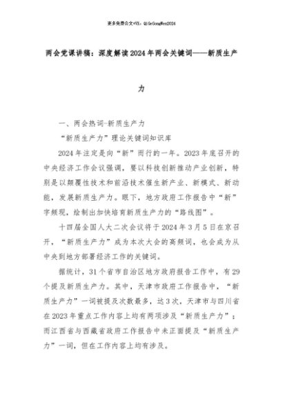 【七哥公文】2024年:两会党课讲稿:深度解读2024年两会关键词——新质生产力+更多免费公文+VX:QiGeGongWen2024