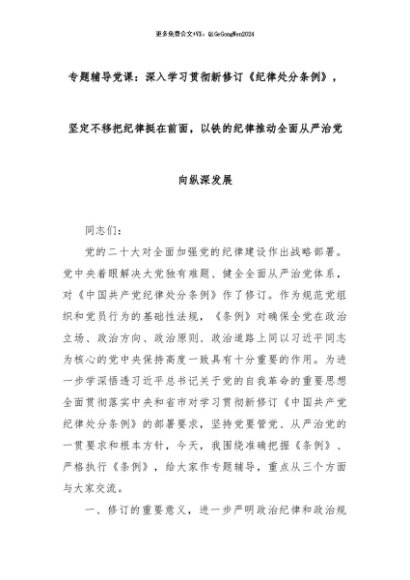 【七哥公文】2024年:专题辅导党课:深入学习贯彻新修订《纪律处分条例》,坚定不移把纪律挺在前面,以铁的纪律推动全面从严治党向纵深发展+更多免费公文+VX:QiGeGongWen2024