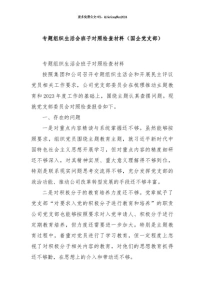 / 【七哥公文】2024年:专题组织生活会班子对照检查材料(国企党支部)+更多免费公文+VX:QiGeGongWen2024
