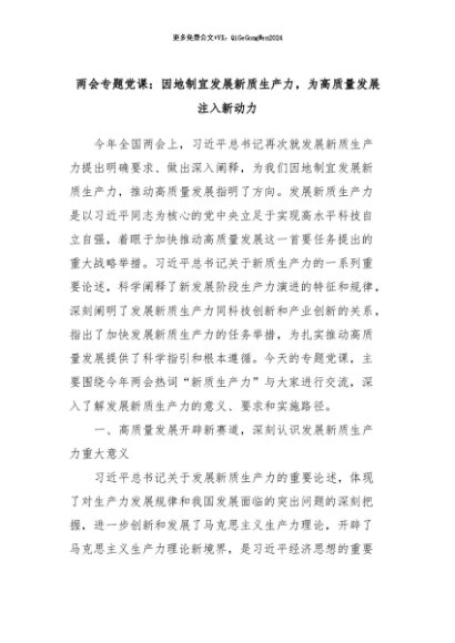 【七哥公文】2024年:两会专题党课:因地制宜发展新质生产力,为高质量发展注入新动力+更多免费公文+VX:QiGeGongWen2024