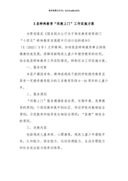 / 【七哥公文】2024年:X县特殊教育“送教上门”工作实施方案+更多免费公文+VX:QiGeGongWen2024