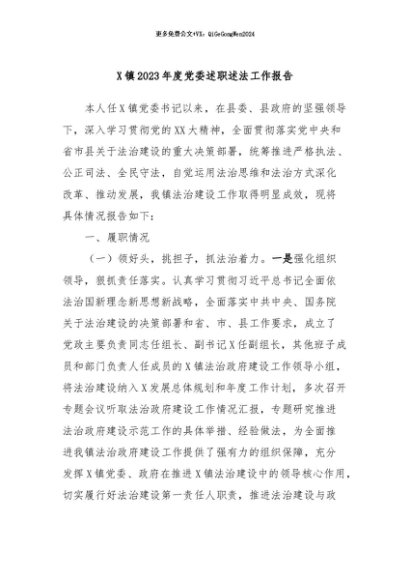 / 【七哥公文】2024年:X镇2023年度党委述职述法工作报告+更多免费公文+VX:QiGeGongWen2024