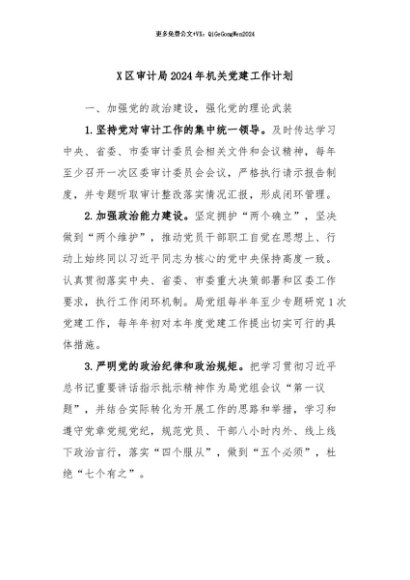 / 【七哥公文】2024年:X区审计局2024年机关党建工作计划+更多免费公文+VX:QiGeGongWen2024
