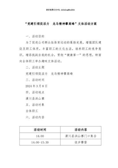 【七哥公文】2024年:“党建引领促活力 龙马精神攀高峰”文体活动方案+更多免费公文+VX:QiGeGongWen2024