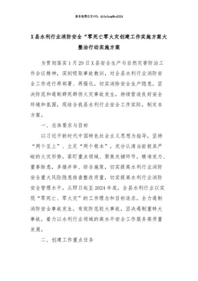 【七哥公文】2024年:X县水利行业消防安全“零死亡零火灾创建工作实施方案大整治行动实施方案+更多免费公文+VX:QiGeGongWen2024