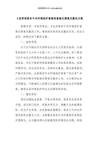 【七哥公文】2024年:X县贯彻落实中央环境保护督察组督察反馈意见整改方案+更多免费公文+VX:QiGeGongWen2024