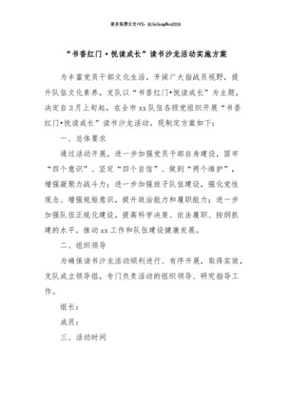 / 【七哥公文】2024年:“书香红门·悦读成长”读书沙龙活动实施方案+更多免费公文+VX:QiGeGongWen2024