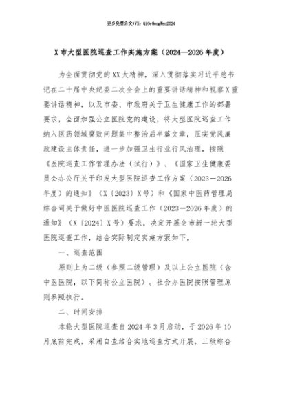 【七哥公文】2024年:X市大型医院巡查工作实施方案(2024—2026年度)+更多免费公文+VX:QiGeGongWen2024