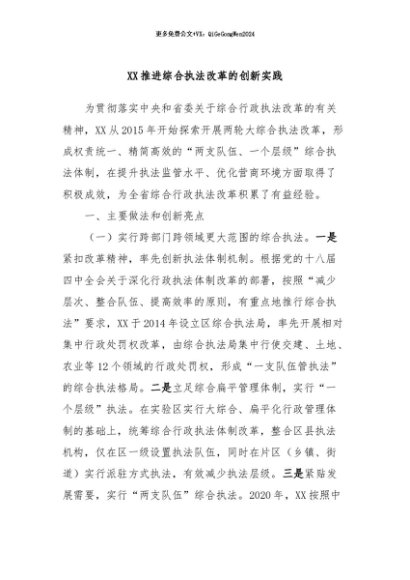 【七哥公文】2024年:XX推进综合执法改革的创新实践+更多免费公文+VX:QiGeGongWen2024