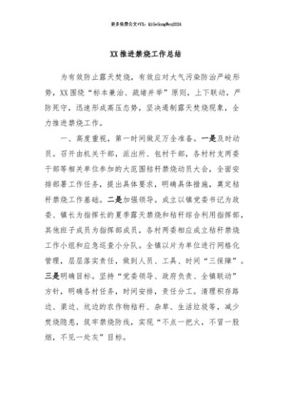 / 【七哥公文】2024年:XX推进禁烧工作总结+更多免费公文+VX:QiGeGongWen2024