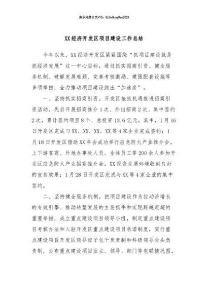/ 【七哥公文】2024年:XX经济开发区项目建设工作总结+更多免费公文+VX:QiGeGongWen2024
