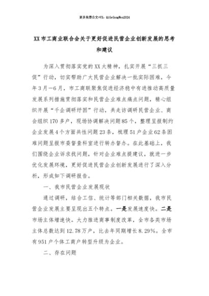 【七哥公文】2024年:XX市工商业联合会关于更好促进民营企业创新发展的思考和建议+更多免费公文+VX:QiGeGongWen2024