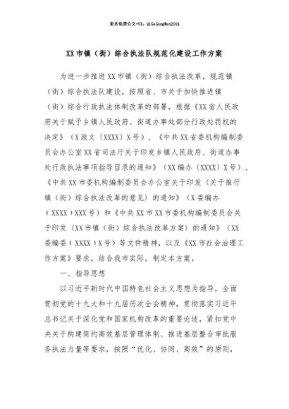 / 【七哥公文】2024年:XX市镇(街)综合执法队规范化建设工作方案+更多免费公文+VX:QiGeGongWen2024