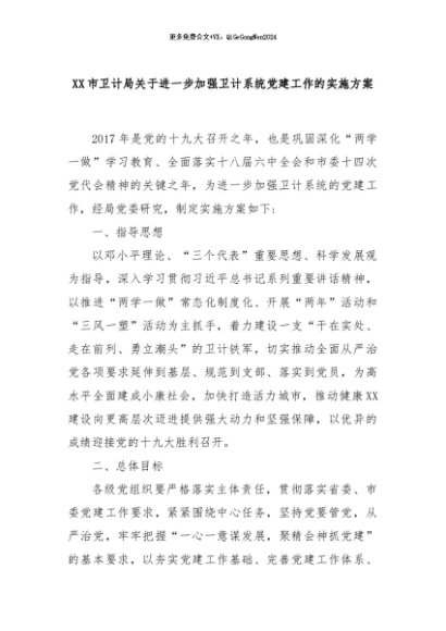 【七哥公文】2024年:XX市卫计局关于进一步加强卫计系统党建工作的实施方案+更多免费公文+VX:QiGeGongWen2024
