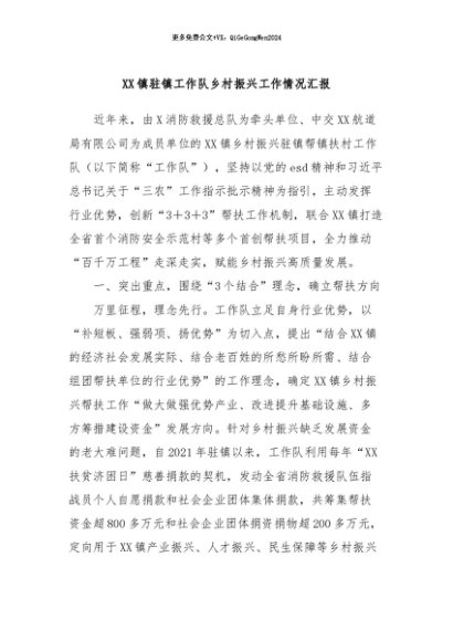 / 【七哥公文】2024年:XX镇驻镇工作队乡村振兴工作情况汇报+更多免费公文+VX:QiGeGongWen2024